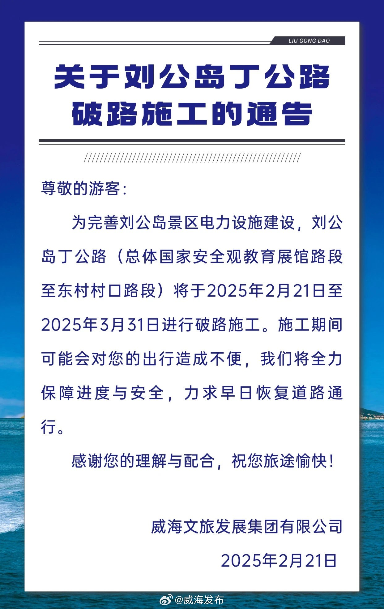 2月21日即日起至3月31日,劉公島部分路段進(jìn)行破路施工。 ???