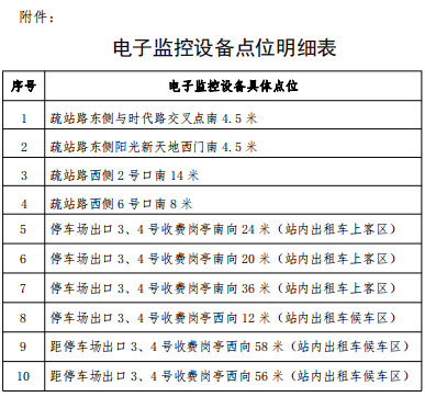 威海站前疏站路西側(cè)2號口至6號口之間相關(guān)區(qū)域以及威海站內(nèi)出租汽車待租區(qū)(運(yùn)用的電子監(jiān)控設(shè)備點(diǎn)位詳見附件)。