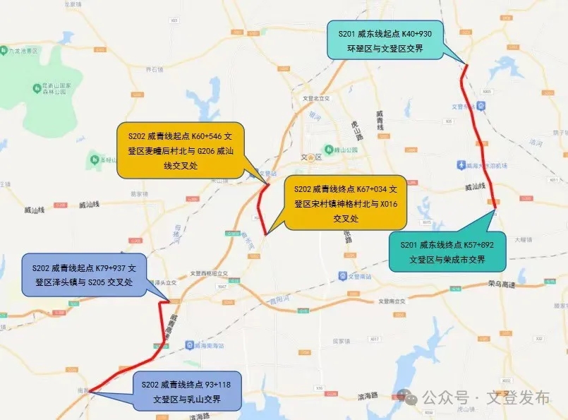 目前文登區(qū)境內(nèi)S201威東線K40+930(環(huán)翠區(qū)與文登區(qū)交界)至K57+892(文登區(qū)與榮成市交界)、S202 威青線K60+546(文登區(qū)麥疃后村北與G206威汕線交叉處)至K67+034(文登區(qū)宋村鎮(zhèn)神格村北與X016交叉處)、S202威青線K79+937(文登區(qū)澤頭鎮(zhèn)與S205交叉處)至K93+118(文登乳山交界)等三處路段進(jìn)行路面改造施工。