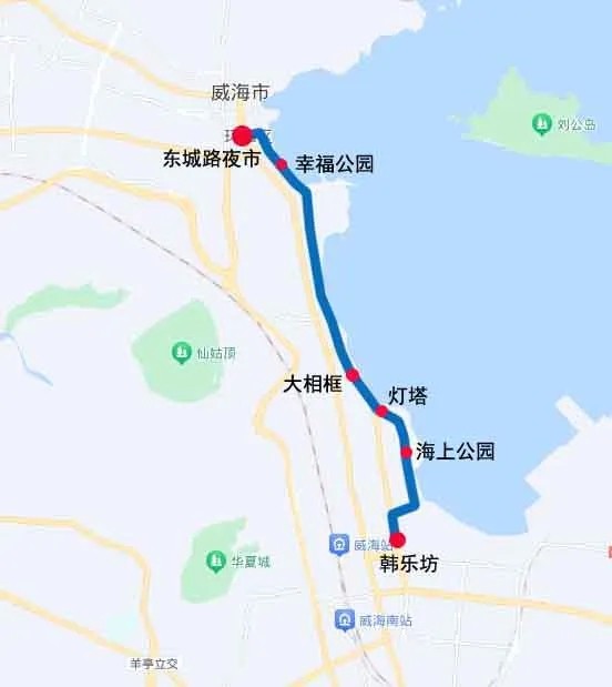 線路由東城路夜市發(fā)車(chē),途經(jīng)大相框(市人社局東)、燈塔、海上公園(慶威花園)、韓樂(lè)坊東(經(jīng)區(qū)中國(guó)銀行)、韓樂(lè)坊(紅星美凱龍)、海上公園(慶威花園)、燈塔、大相框(市人社局東)、幸福公園后返回東城路夜市。